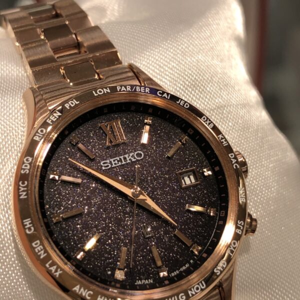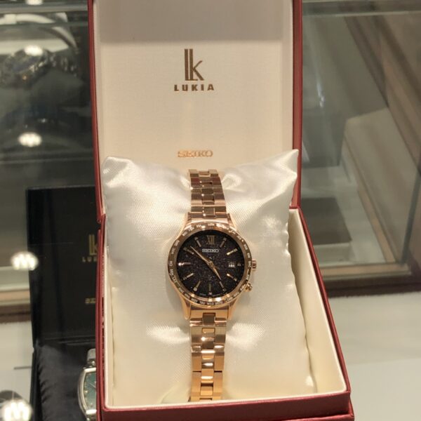 黒っぽく見えてしまう文字盤ですが、ピンクゴールド色のケースとバンドで、女性らしいスタイルになっております♪