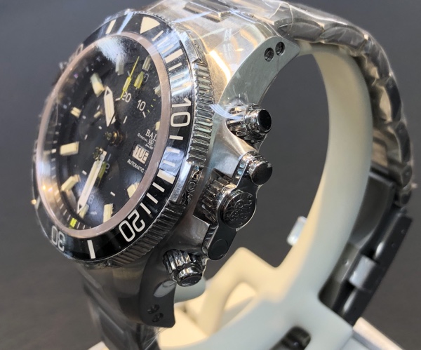 クロノグラフ機能も搭載しているので、セーフティーロック・クラウンシステムの上下に配置されたプッシュボタンの存在感に圧倒されます!